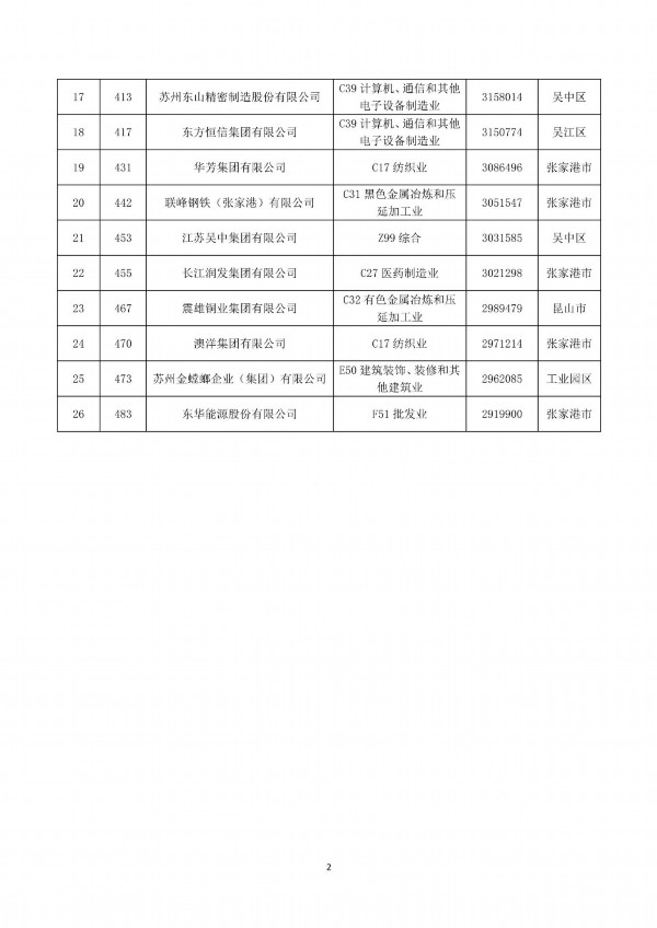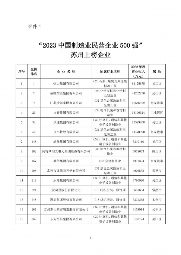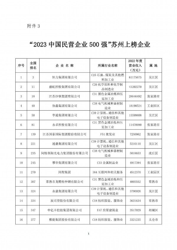 榜单显示,苏州共有26家企业入围“2023中国民营企业500强”,25家企业入围“2023中国制造业民营企业500强”,均与上年持平,上榜企业数双双位居全省第一。同时,有2家苏州企业入围“2023中国服务业民营企业100强”,比上年增加1家。恒力集团再次荣获“2023中国制造业民营企业500强”第1名。