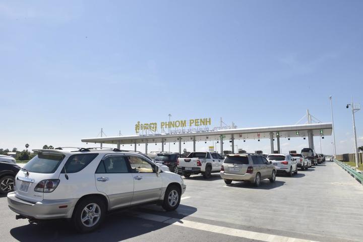 2022年11月7日,车辆在柬埔寨首都金边的金港高速公路入口处排队。金港高速公路连接柬埔寨首都金边和该国最大深水海港西哈努克港。