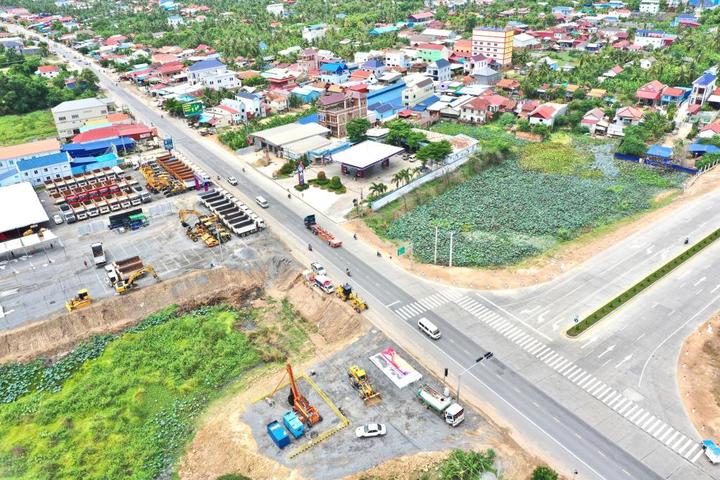 这是6月5日在柬埔寨干丹省拍摄的金巴高速公路施工起点(无人机照片)。
