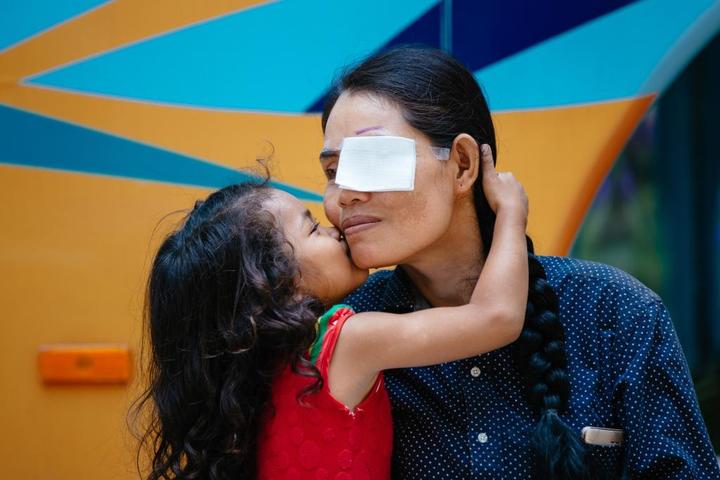 2019年3月15日,在柬埔寨磅湛省医院,即将接受白内障手术的患者孙美乐接受女儿的亲吻祝福。在接受了中国医疗队的白内障义诊手术后,她的视力逐步恢复,生活有了新的光明和希望。