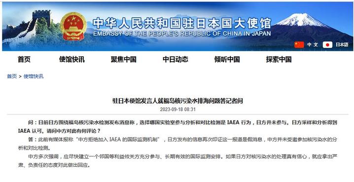 答:此前有媒体报称“中方拒绝加入 IAEA 的国际监测机制”,日方发布的信息再次印证这一报道是假消息,中方并未受邀参加核污染水的分析和对比检测。