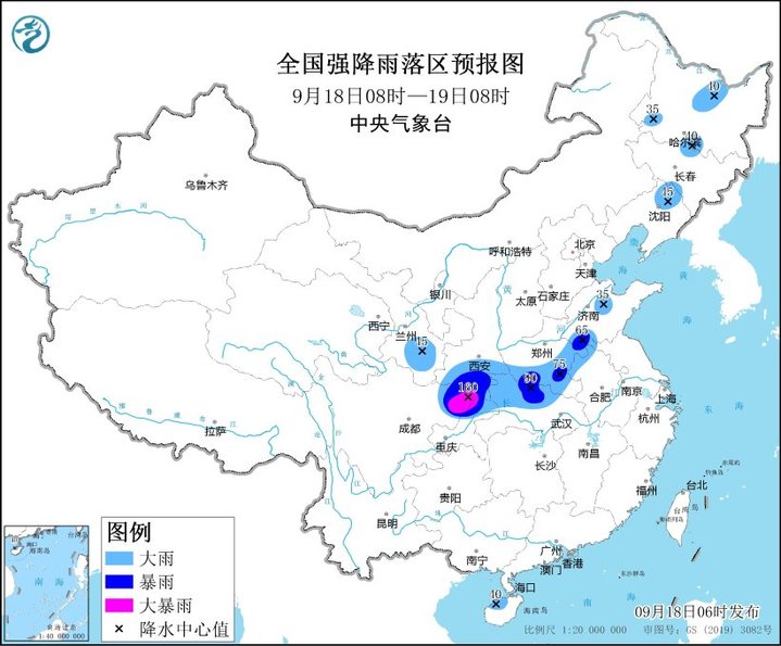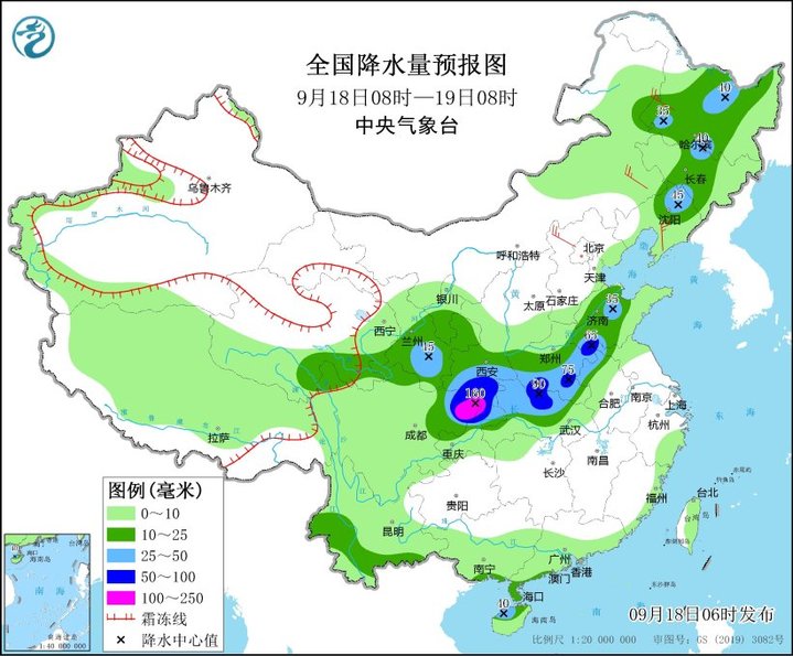 9月18日08时至19日08时,黑龙江大部、吉林中部、辽宁北部、甘肃南部、宁夏中南部、陕西南部、四川东北部、重庆北部、湖北西部和北部、河南大部、山东大部等地部分地区有中到大雨,其中,四川东北部、重庆北部、陕西东南部、湖北北部、河南南部、山东西南部等地部分地区有暴雨,局地有大暴雨(100~160毫米)。内蒙古东部、东北地区大部、河北北部等地部分地区有4~5级风。