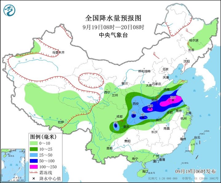 9月19日08时至20日08时,陕西中南部、四川东部、重庆大部、湖北大部、河南大部、山东中南部、安徽中北部、江苏中北部等地部分地区有中到大雨,其中,四川盆地南部、重庆北部、湖北西南部和北部、河南南部和东部、山东南部、苏皖北部等地部分地区有暴雨,局地有大暴雨(100~200毫米)。内蒙古东部、东北地区大部、黄淮西部、江淮北部、四川盆地等地部分地区有4~6级风。