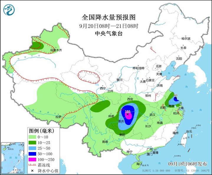 9月20日08时至21日08时,新疆伊犁河谷、陕西东南部、四川西北部和东部、重庆、贵州中北部、湖北西部、江苏大部、安徽中部等地部分地区有中到大雨,其中,陕西东南部、四川东北部、重庆中东部、湖北西南部、江苏中部等地部分地区有暴雨,局地有大暴雨(100~120毫米)。内蒙古东部、江淮、江南东北部、四川盆地等地部分地区有4~5级风。