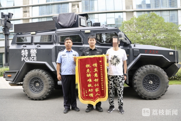 9月19日上午,镇江市民王先生向巡特警大队赠送一面印有“情真意切似家人,抚危解难救助情”字样的锦旗,对巡特警大队辅警积极采取措施帮助自己脱离生命危险表示感谢。