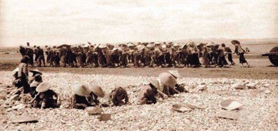 △抗战期间,中国民工手搬石块、肩拉石碾修筑机场。(资料图片)