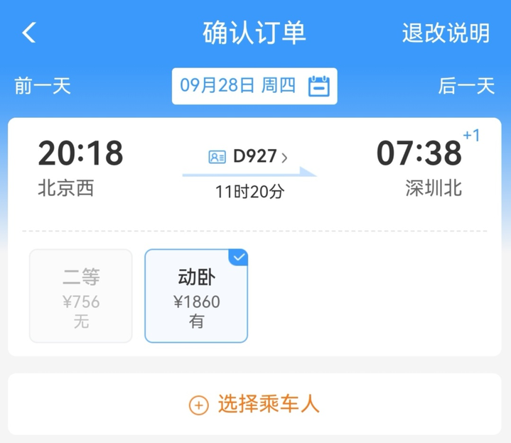 近日,有网友在社交媒体发文称,北京到深圳的D927卧铺,上铺平日1150元,但在9月28日(国庆假期前一日)价格涨到1860元,下铺动卧价格达到了2090元。