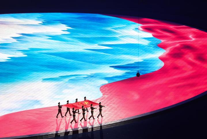 地屏上,一幅红绸飞掠壮丽河山。8名仪仗兵步伐铿锵,护旗入场。“我爱你中国,我爱你春天蓬勃的秧苗……”动人的赞歌深情唱响。