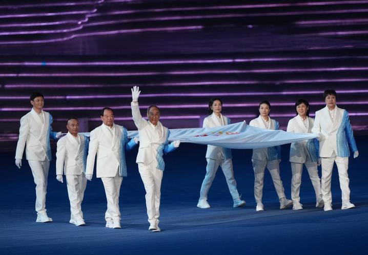 音乐响起,8名中国运动员、教练员代表共执亚奥理事会会旗入场。伴随着亚奥理事会会歌,会旗缓缓上升,在杭州高高飘扬。