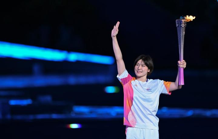9月23日,火炬手叶诗文在开幕式上进行火炬传递。新华社记者 李一博 摄