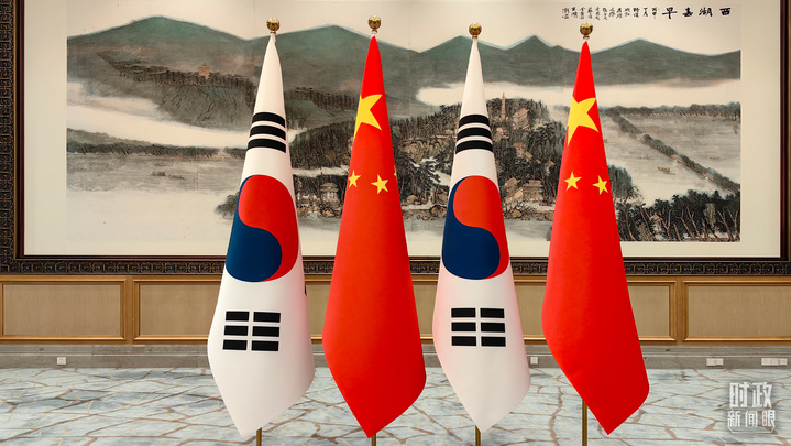 △会见现场摆放的中国、韩国国旗。(总台央广记者潘毅拍摄)