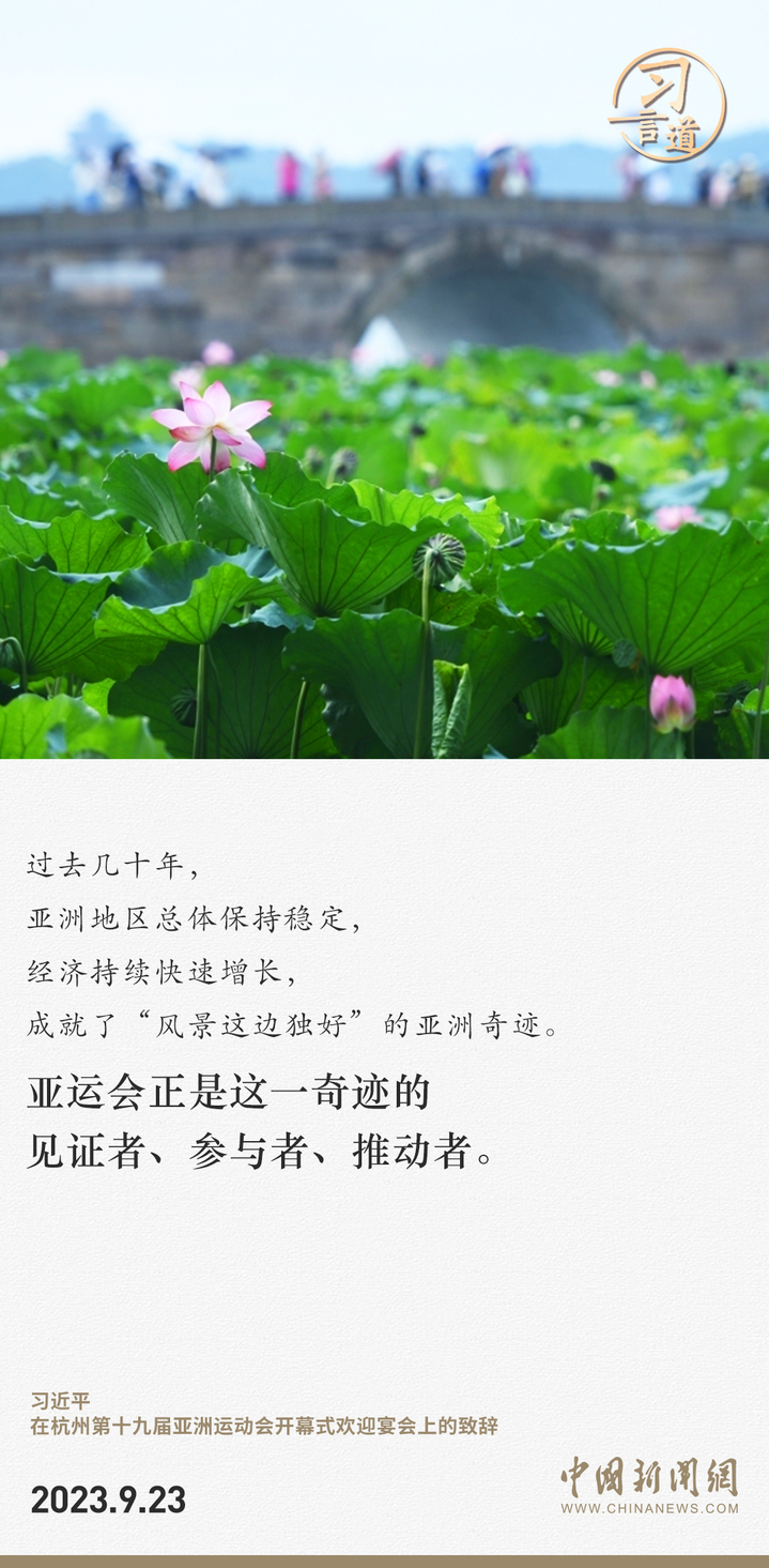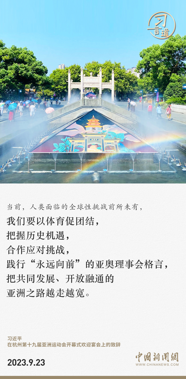 9月23日中午,国家主席习近平和夫人彭丽媛在浙江省杭州市西子宾馆举行宴会,欢迎来华出席杭州第19届亚洲运动会开幕式的国际贵宾。习近平发表致辞指出——