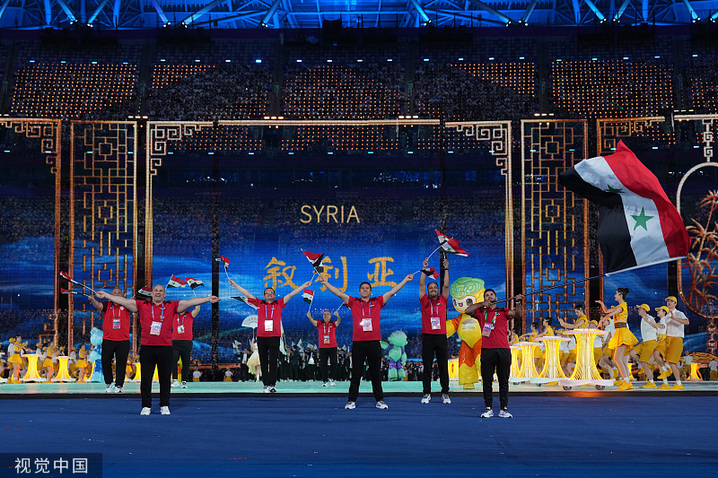 《环球时报》记者在开幕式现场看到,在运动员入场过程中,每个代表团的亮相都获得观众的欢呼和掌声,充分展现东道主的热情好客和大国风范。当叙利亚代表团入场时,巴沙尔总统和夫人站起来向他们挥手致意,叙利亚运动员迟迟不愿离去。这一幕被展现在现场大屏幕上,现场观众发出巨大的欢呼声。