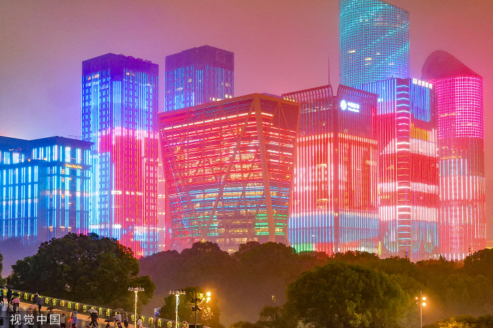 2023年9月22日晚,浙江杭州,钱塘江畔的楼宇“上演”灯光秀,霓虹璀璨迎接即将到来的亚运盛会。