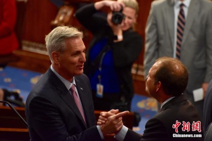 资料图:美国国会众议院议长麦卡锡(左)。中新社记者 沙晗汀 摄