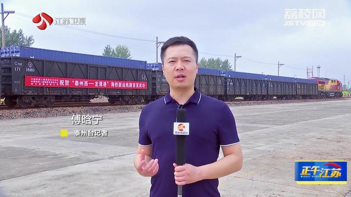 泰州台记者傅晗宁:“现在我所在的位置是宁启铁路泰州西站的‘泰州西至龙潭港’海铁联运线路首发仪式的现场。大家可以看到我身后满载集装箱的韩国货物列车即将从泰州西站缓缓驶出,奔赴南京龙潭港。”