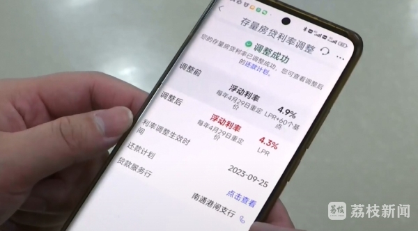 施鹏翔于2020年在南通市区购买了首套住房,当时他在工商银行商业贷款275万,分30年还清。“从原来的4.9%调整到了4.3%,原来月供是一万四千六百多,现在月供只要一万三千七百多。”今天早晨,他在手机上打开工行APP,惊喜地发现,他的贷款利率已经调整成功。