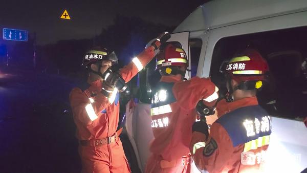 消防员抵达后,看到现场情况为面包车追尾前方货车,导致后方面包车车头严重变形,面包车司机被困。经勘察,被困人员为一名女性,面包车司机意识较为清醒,驾驶室车门无法正常打开。随后消防救援人员立即展开救援,一组消防救援人员使用液压工具组对面包车驾驶室车门进行破拆,一组消防救援人员从副驾驶车门进入,保护面包车司机遭受二次伤害。经过大约五分钟的奋力救援,被困司机成功被消防救援人员救出。最后消防救援人员将被困人员抬至担架,医护人员将被困人员送往附近医院进行救治。
