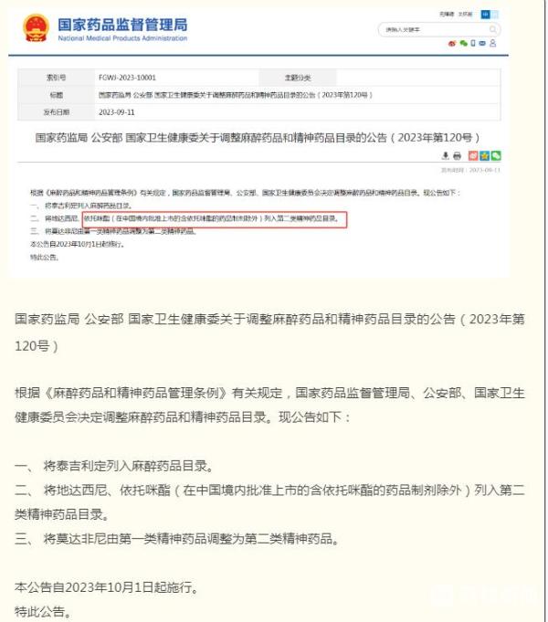 警方提示:今年九月,国家药监局、公安部、国家卫生健康委联合发布公告,对麻醉药品和精神药品目录进行调整,决定从今年的10月1日起,将依托咪酯(在中国境内批准上市的含依托咪酯的药品制剂除外)等药品列入第二类精神药品目录。