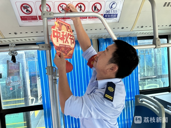 汽车四队D58路党员驾驶员李想军在车厢中挂上了中秋节和国庆节的主题卡片。“看着大街小巷都在悬挂国旗,营造国庆气氛,我装扮这个‘贺中秋 迎国庆’主题车厢,除了表达自己对祖国的热爱,还希望借此表达对广大乘客的节日祝福,营造浓厚的节日氛围。”李想军说。