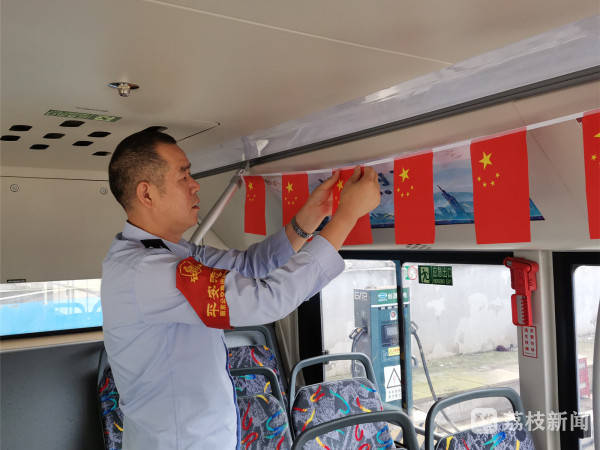 汽车一队555路驾驶员邱承涌的车厢也是节日氛围满满,登上他的主题公交车,两侧扶手杆及车窗则被一面面小国旗装饰得色彩鲜明,红色基调的主题车厢成为南京街头的一道靓丽风景,既庄重又喜庆。