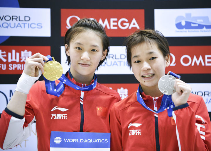 8月5日,陈芋汐(左)和全红婵在颁奖仪式后展示奖牌。当日,在德国柏林举行的2023年跳水世界杯总决赛女子10米台决赛中,陈芋汐以420.30分的成绩夺得冠军,全红婵以408.10分的成绩获得亚军。新华社记者 任鹏飞 摄