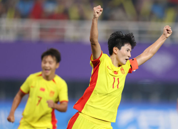 9月28日,中国队球员王珊珊(右)在比赛中庆祝进球。当日,在杭州亚运会足球小组赛女子A组比赛中,中国队对阵乌兹别克斯坦队。新华社记者 贾浩成 摄
