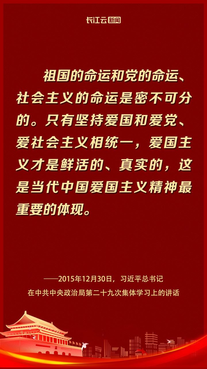 “爱国,是人世间最深层、最持久的情感,是一个人立德之源、立功之本。”它扎根在亿万同胞的血肉里,深藏在中华民族伟大复兴的理想里,爱国不是一句口号,而是一种情怀和担当。 十八大以来,习近平总书记在不同场合多次谈到“爱国”,提出爱国主义是中华民族民族精神的核心。国庆74周年之际,让我们一起重温习近平总书记谈“爱国”的经典话语。