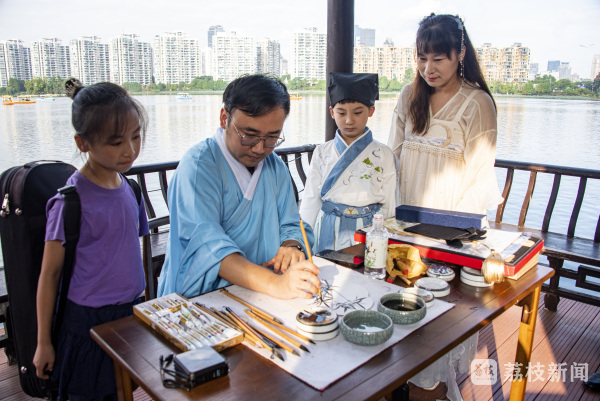 游客纷纷来到南京莫愁湖烟雨文化节上,有的乘坐游船观赏莫愁湖秋色、有的扎制彩灯、有的看舞狮、有的体验琴棋书画、有的品赏美食……处处洋溢着中秋国庆的节日气氛。