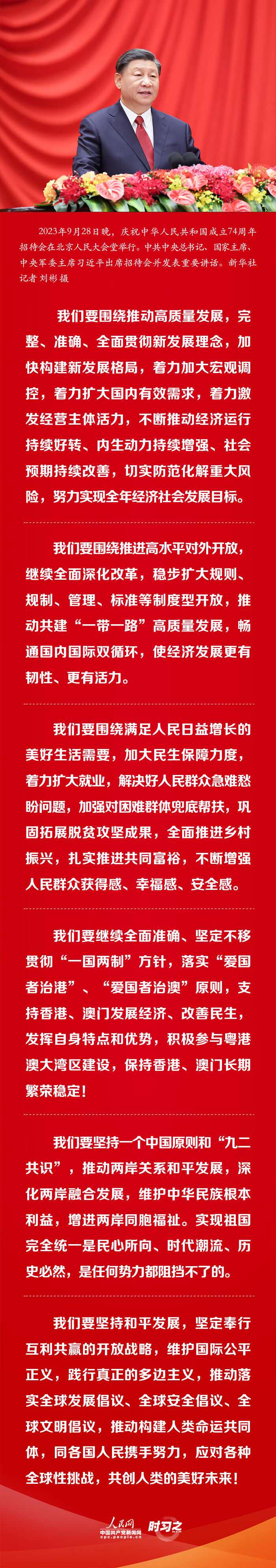 9月28日晚,庆祝中华人民共和国成立74周年招待会在人民大会堂举行。中共中央总书记、国家主席、中央军委主席习近平出席招待会并发表重要讲话。他强调,新征程上,我们的前途一片光明。团结就是力量,信心赛过黄金。我们要坚定信心,振奋精神,团结奋斗,继续爬坡过坎、攻坚克难,坚定不移朝着强国建设、民族复兴的宏伟目标奋勇前进。