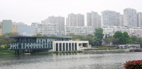 一座两层玻璃楼依河而立