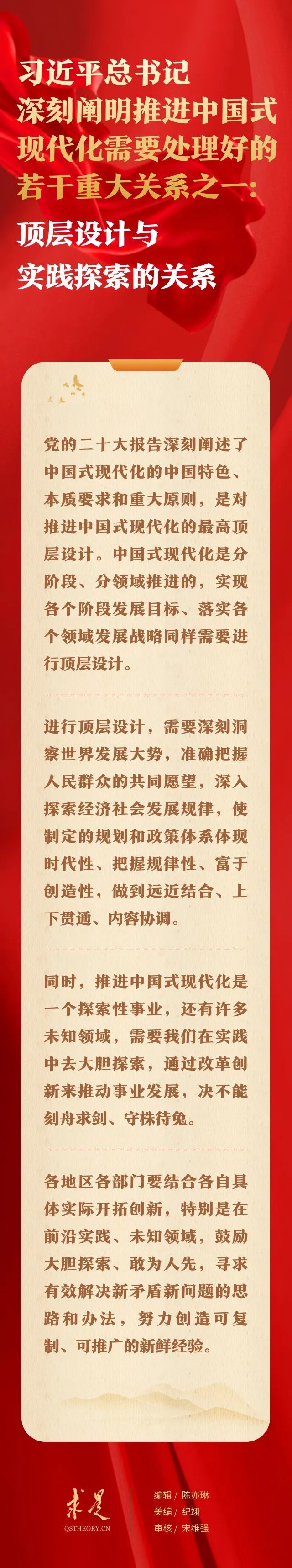 10月1日出版的第19期《求是》杂志刊发习近平总书记重要文章《推进中国式现代化需要处理好若干重大关系》。在这篇重要文章中,总书记从“顶层设计与实践探索的关系”、“战略与策略的关系”、“守正与创新的关系”、“效率与公平的关系”、“活力与秩序的关系”、“自立自强与对外开放的关系”6个方面,深刻阐明推进中国式现代化需要处理好的一系列重大关系,提出明确要求。