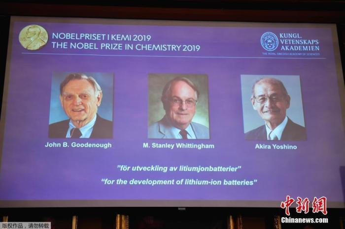资料图:当地时间2019年10月9日,瑞典皇家科学院将2019年诺贝尔化学奖授予约翰·古迪纳夫、斯坦利·惠廷厄姆和吉野彰,以表彰他们在锂电池发展上所做的贡献。