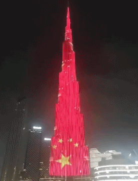 近日,位于阿联酋迪拜的世界最高楼哈利法塔再度点亮“中国红”,并上演中国国庆主题灯光秀,庆祝中华人民共和国成立74周年。