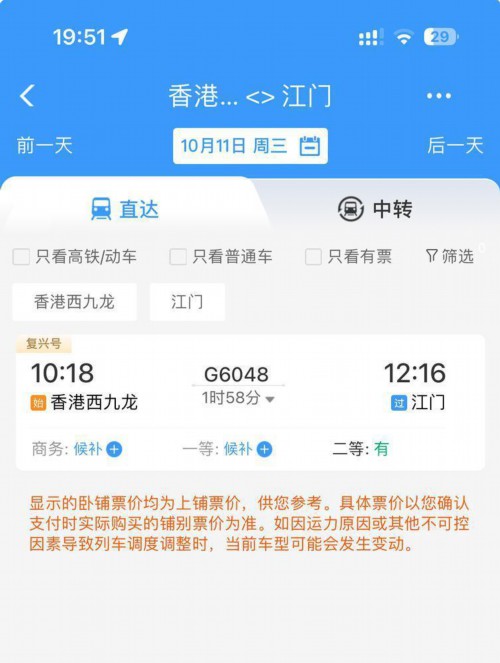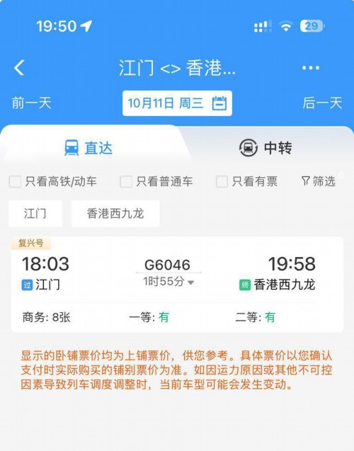 旅客10月4日起可购买新增班次及站点的车票。记者在12306App上查询发现,以江门出发为例,每天有一班车,18:03发出,19:58到达,历时1时55分可达香港西九龙站。途中经停广州南站、虎门站、深圳北站。江门至香港西九龙票价为:二等座272元,一等座423元,商务座811元。而香港西九龙往江门方向的列车同样也是每天一趟,上午10:18发车,12:16到达。