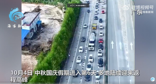 据海客新闻官方微博,10月4日,中秋国庆假期进入第6天,多地陆续迎来返程高峰。实拍全国各地高速路况,红色车灯连成线,车队“龟速”行驶堵成长龙。有网友晒出高速路况画面表示“特意提前三天回去,没想到又堵路上了。”、“带回的特产都要在路上吃完了”。