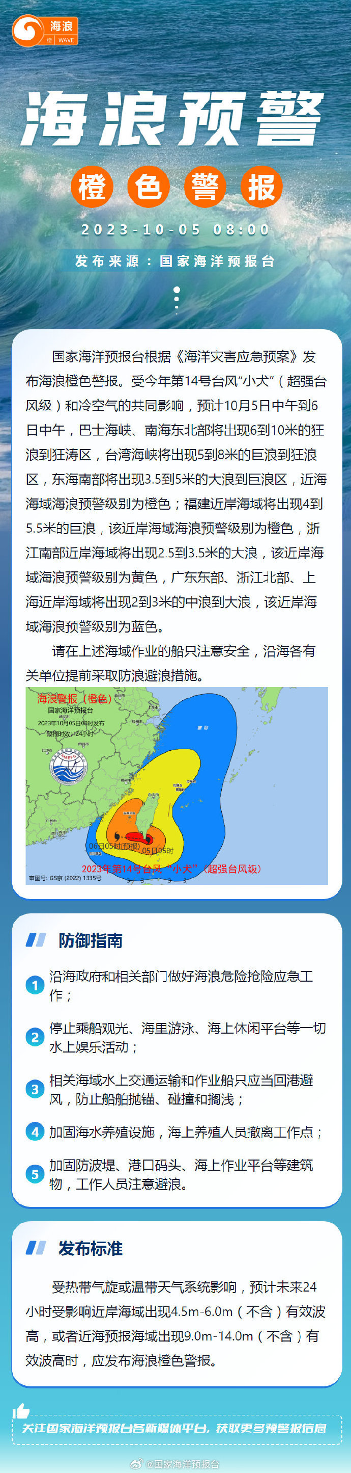 央视网消息:据@国家海洋预报台 微博消息,国家海洋预报台根据《海洋灾害应急预案》发布海浪橙色警报。受今年第14号台风“小犬”(超强台风级)和冷空气的共同影响,预计:10月5日中午到6日中午,巴士海峡、南海东北部将出现6到10米的狂浪到狂涛区,台湾海峡将出现5到8米的巨浪到狂浪区,东海南部将出现3.5到5米的大浪到巨浪区,近海海域海浪预警级别为橙色;福建近岸海域将出现4到5.5米的巨浪,该近岸海域海浪预警级别为橙色,浙江南部近岸海域将出现2.5到3.5米的大浪,该近岸海域海浪预警级别为黄色,广东东部、浙江北部、上海近岸海域将出现2到3米的中浪到大浪,该近岸海域海浪预警级别为蓝色。请在上述海域作业的船只注意安全,沿海各有关单位提前采取防浪避浪措施。