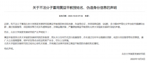 10月3日,北京大学国家发展研究院发布《关于不法分子冒用黄益平教授姓名、伪造身份信息的声明》: