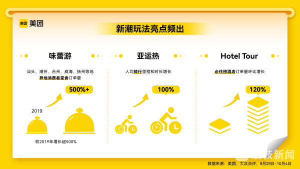 中秋、国庆叠加亚运热潮。10月5日,某平台发布的“十一”黄金周消费数据显示,全国服务零售日均消费规模较2019年同期增长153%,迎五年来最旺“十一”,上海、北京、成都、重庆、深圳消费规模位居全国前五。其中,全国餐饮堂食消费规模较2019年同期增长254%。味蕾游、亚运骑行热、Hotel Tour等新潮玩法亮点频出。