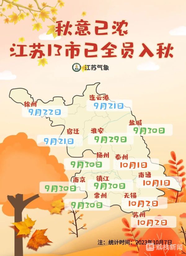 据江苏省气象台最新发布的消息:截至10月2日,江苏13市集体入秋完毕。气象意义上的秋天已经全面到来!