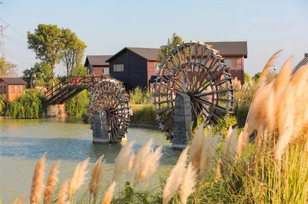 水车、小桥、木屋,一泓碧水、粼粼波光,阳光下的芦苇镶着一层金边,随风飘动、沙沙作响,是属于这个季节的限定美景。