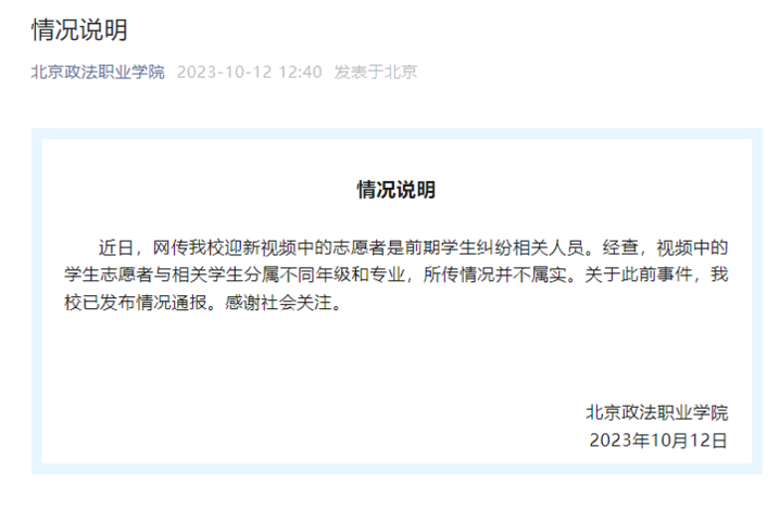 荔枝新闻讯 近日,网传北京政法职业学院迎新视频中的志愿者是前期学生纠纷相关人员。10月12日,北京政法职业学院在其官方微信公众号发布情况说明:
