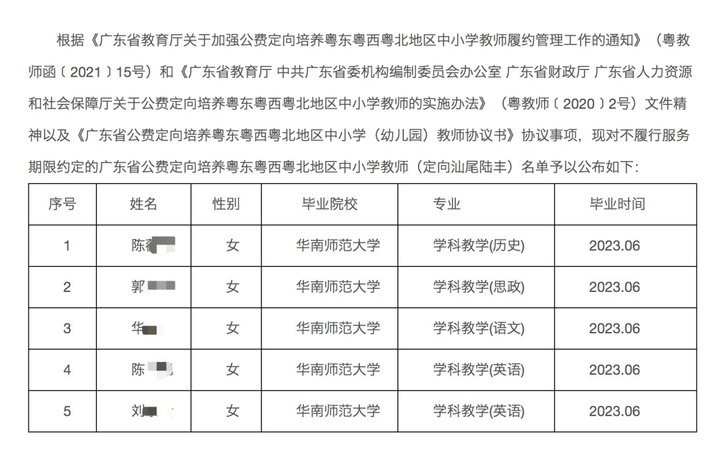 近日,广东陆丰市教育局发布《广东省公费定向培养粤东粤西粤北地区中小学教师(定向汕尾陆丰)违约人员名单》。