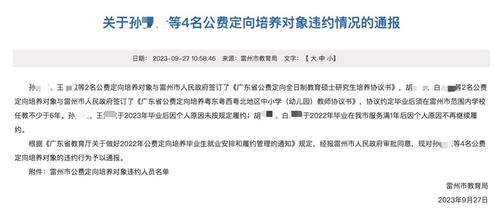 9月27日,广东雷州市教育局发布通报,公布公费定向培养对象违约人员名单。
