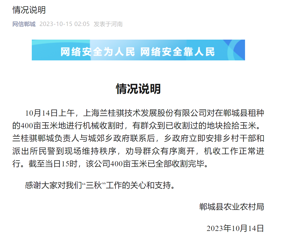荔枝新闻讯 河南郸城县农业农村局通报,10月14日上午,上海兰桂骐技术发展股份有限公司对在郸城县租种的400亩玉米地进行机械收割时,有群众到已收割过的地块捡拾玉米。兰桂骐郸城负责人与城郊乡政府联系后,乡政府立即安排乡村干部和派出所民警到现场维持秩序,劝导群众有序离开,机收工作正常进行。截至当日15时,该公司400亩玉米已全部收割完毕。
