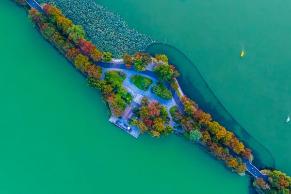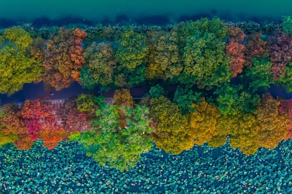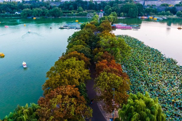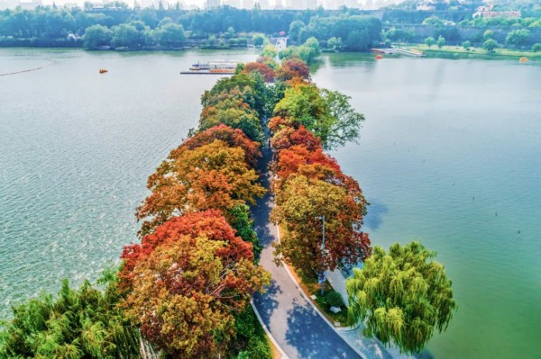 随着秋意渐浓,玄武湖的台菱堤层林尽染,泛舟湖上远望,它就如一条色彩斑斓的屏风,美得让人挪不开眼。