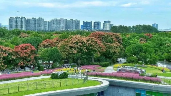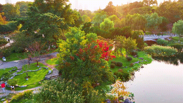 秋天的滨江公园明轩观澜屋顶花园,各种颜色交相辉映,构成五彩斑斓的秋日光景。