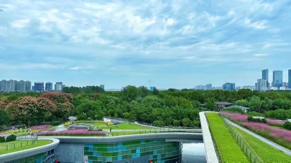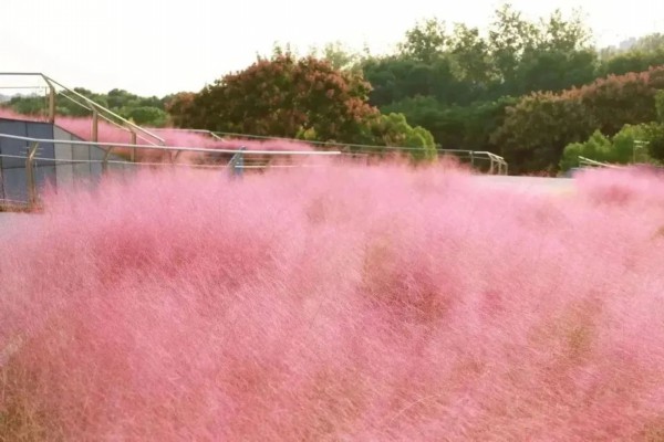 走近屋顶花园,便会被大片的粉色花海所吸引。一株株粉黛乱子草随微风律动,如同粉色的浪花,在海面上下起伏。