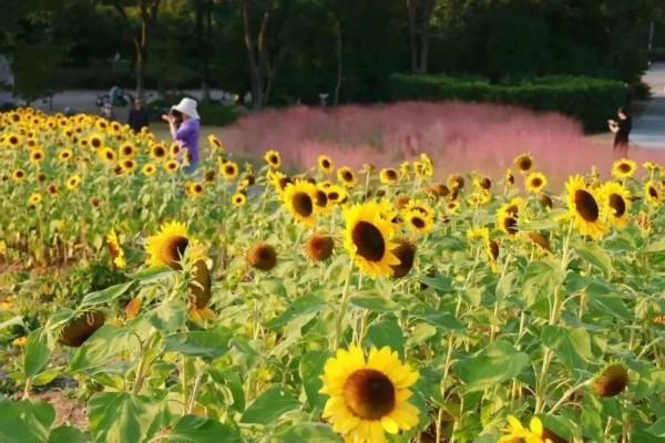 除了粉黛乱子草,向日葵也是今年秋天的主角。金灿灿的太阳花是独属于秋日的色彩,它像是明媚的阳光,热烈而绚烂。