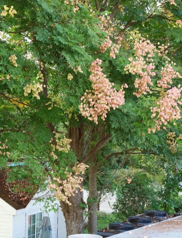 一株株栾树结出火红的果实,像串串火红的小铃铛挂在枝头,在蓝天下熠熠生辉,这抹热烈的红色渲染了灿烂的秋天。